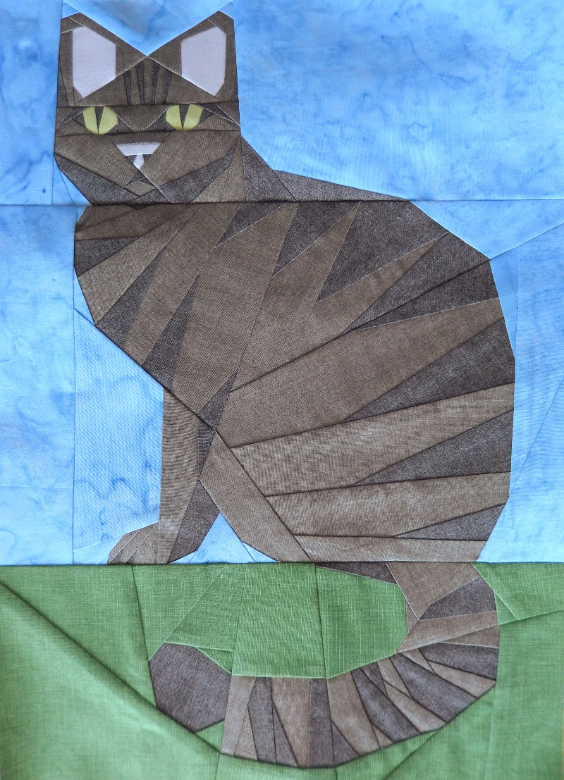 You can‘t say exactly how many fabric you will need when you paperpiece but I think that 12“ over the entire fabric width of the blue background and the same from the dark and light cat fur fabric will be okay. From the green background I think 10“ over the entire fabric width would be enough..